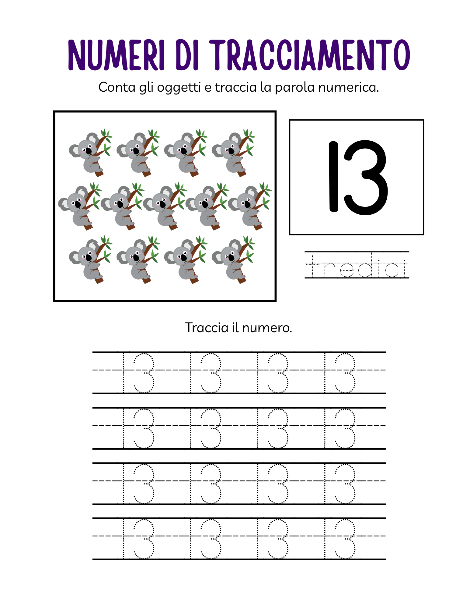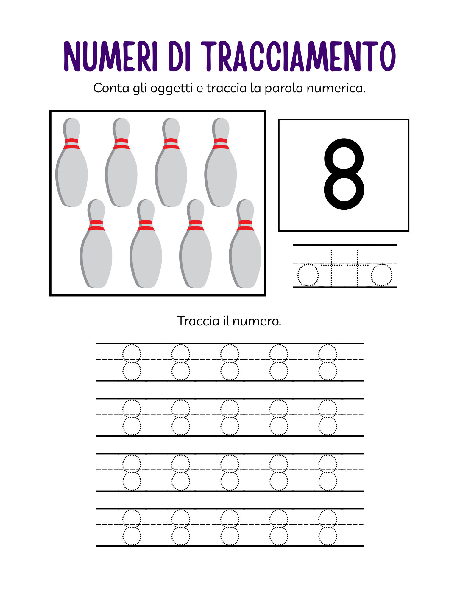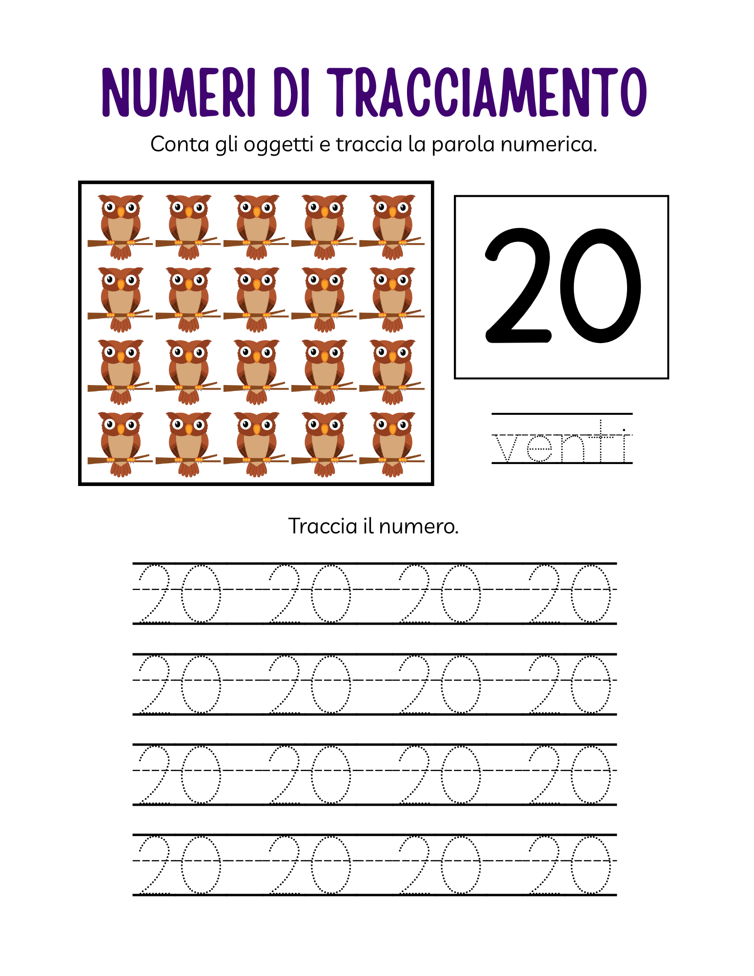 - Sezioni di Tracciamento: Esercizi per tracciare la forma di ogni numero e della parola numerica corrispondente.